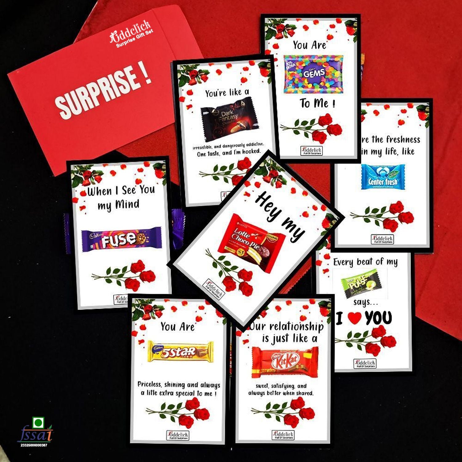 Show your love in the sweetest way possible with our "Sweetheart's Delight" gift set! This unique combo features a curated selection of popular chocolates and candies, each paired with a heartfelt, romantic message card.